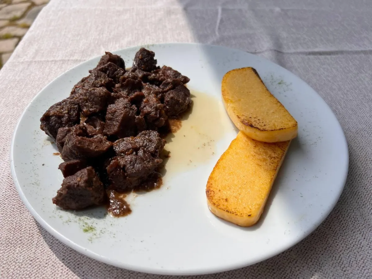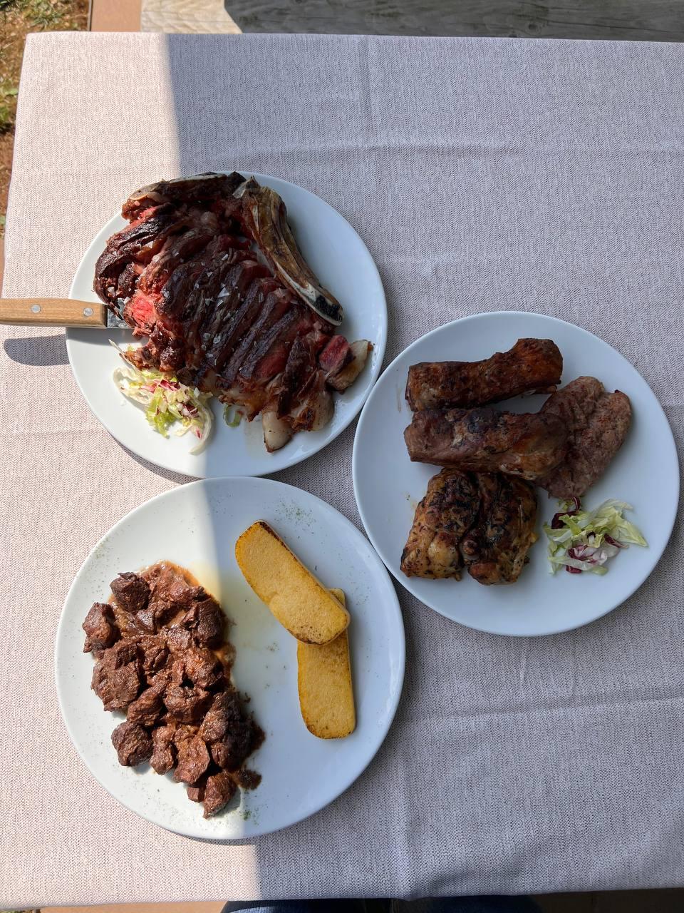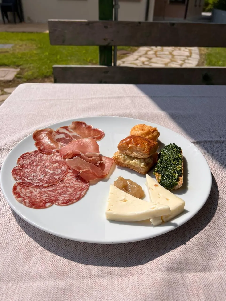 Sopressa nostrana, Prosciutto crudo, Coppa, Formaggio di nostra produzione con marmellata di cipolle cotte ae bronse, Sfogliatina con asparagi e pancetta, Crostino con pesto di aglio orsino, Uovo fritto con crema di patate